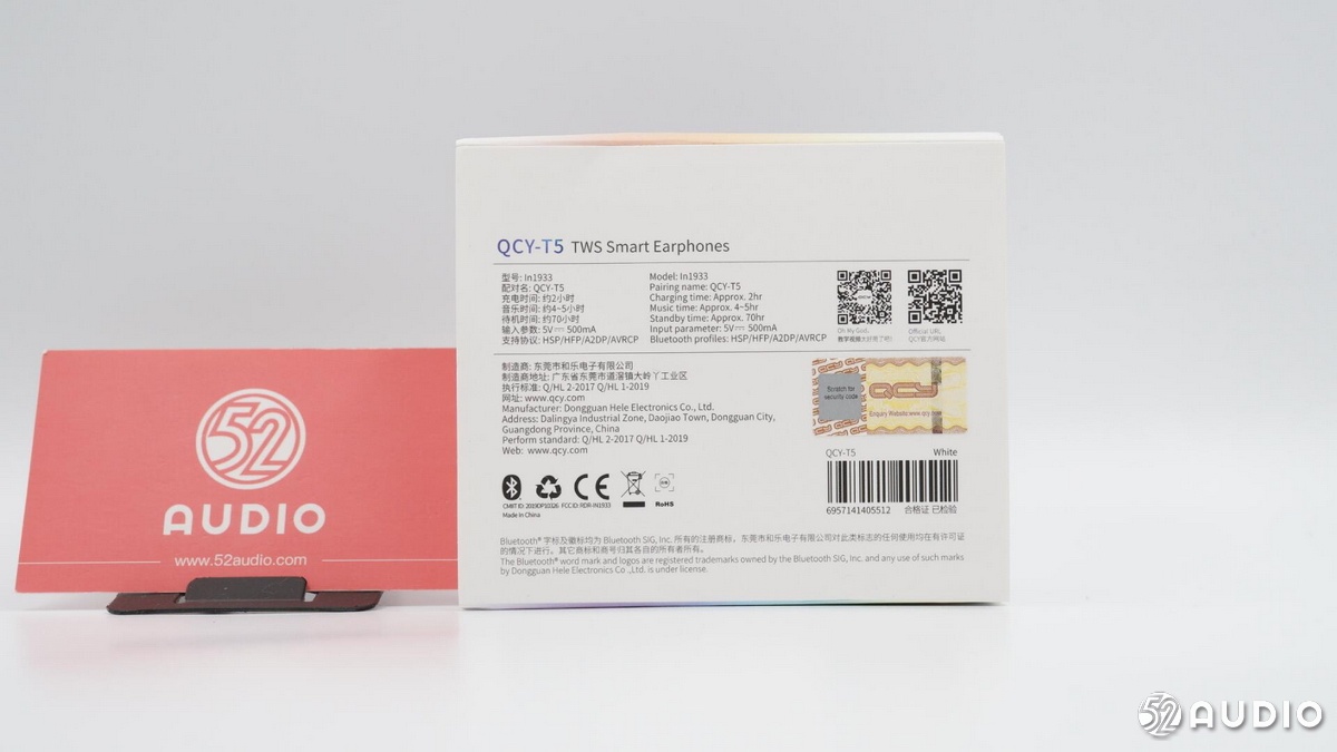 包裝盒背面是一組中英文對照的產(chǎn)品信息,主要內(nèi)容有:QCY T5 TWS藍(lán)牙耳機(jī),型號In1933,音樂播放時間約4-5小時,輸入?yún)?shù)5V?500mA,支持協(xié)議:HSP/HFP/A2DP/AVRCP,制造商:東莞市和樂電子有限公司。此外還有一些認(rèn)證信息和防偽查詢信息等。