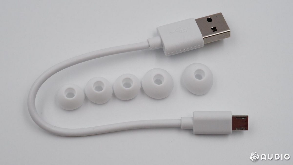 充電線為USB-A to Micro-USB 接口,附贈了兩對不同尺寸的硅膠耳塞(多給了一個)。