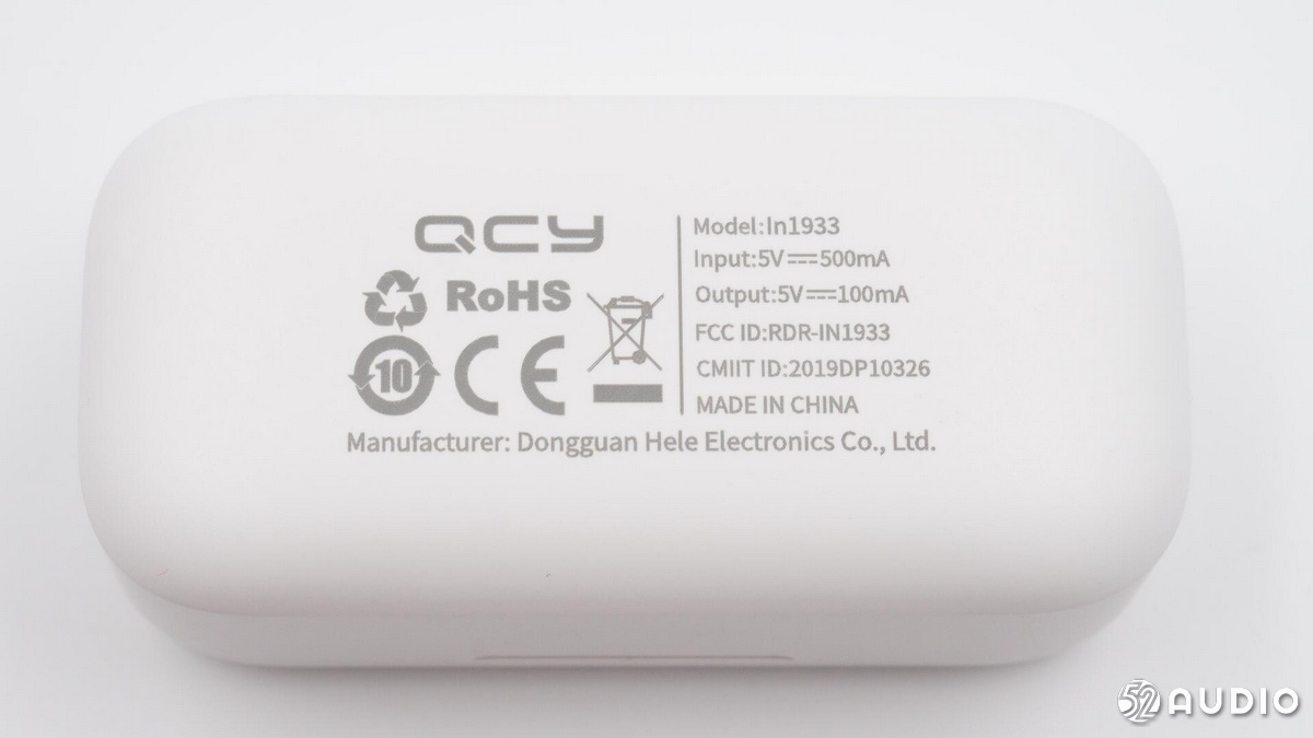 充電盒底部信息,型號:In1933,輸入:5V?500mA,輸出:5V?100mA。