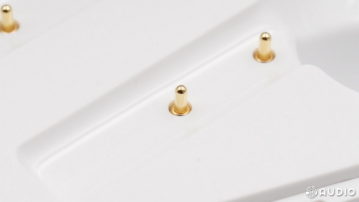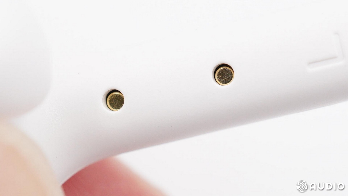 耳機(jī)柄內(nèi)側(cè)的充電觸點(diǎn),分得比較開。