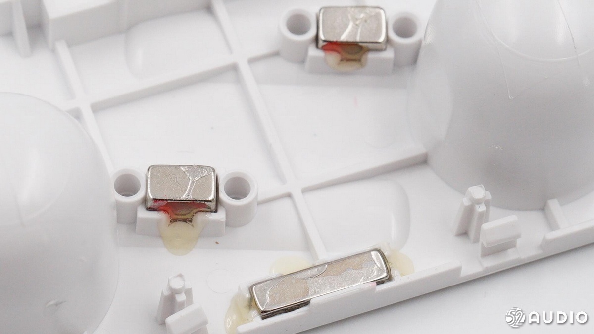 充電座艙內(nèi)側(cè)的三塊磁鐵,兩塊小的用于固定耳機(jī),一塊大的用于吸附充電盒蓋。