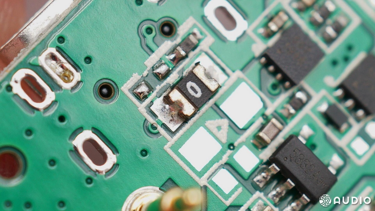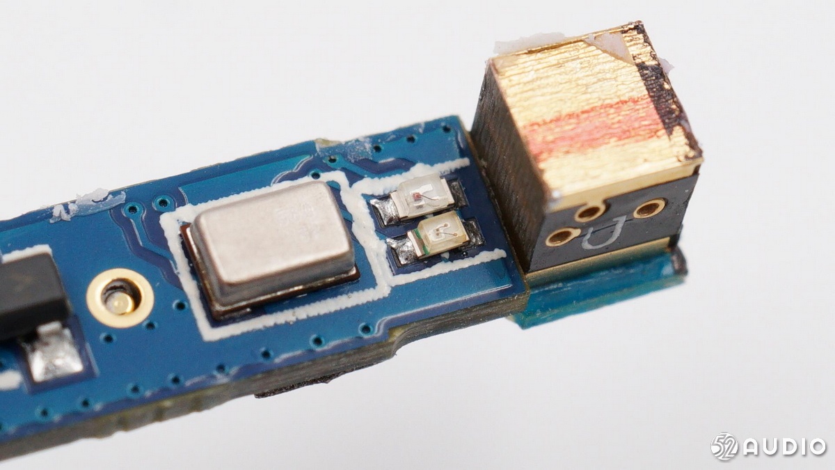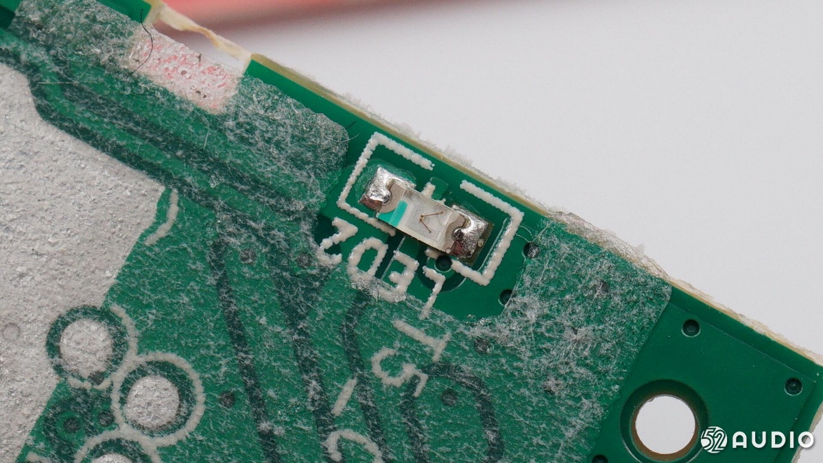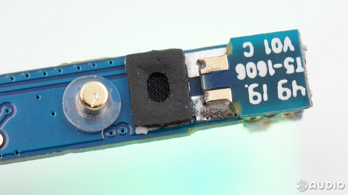 主板背面從左至右依次是藍(lán)牙天線、麥克風(fēng)拾音孔的保護(hù)罩、充電銅柱和導(dǎo)線的焊點(diǎn)。
