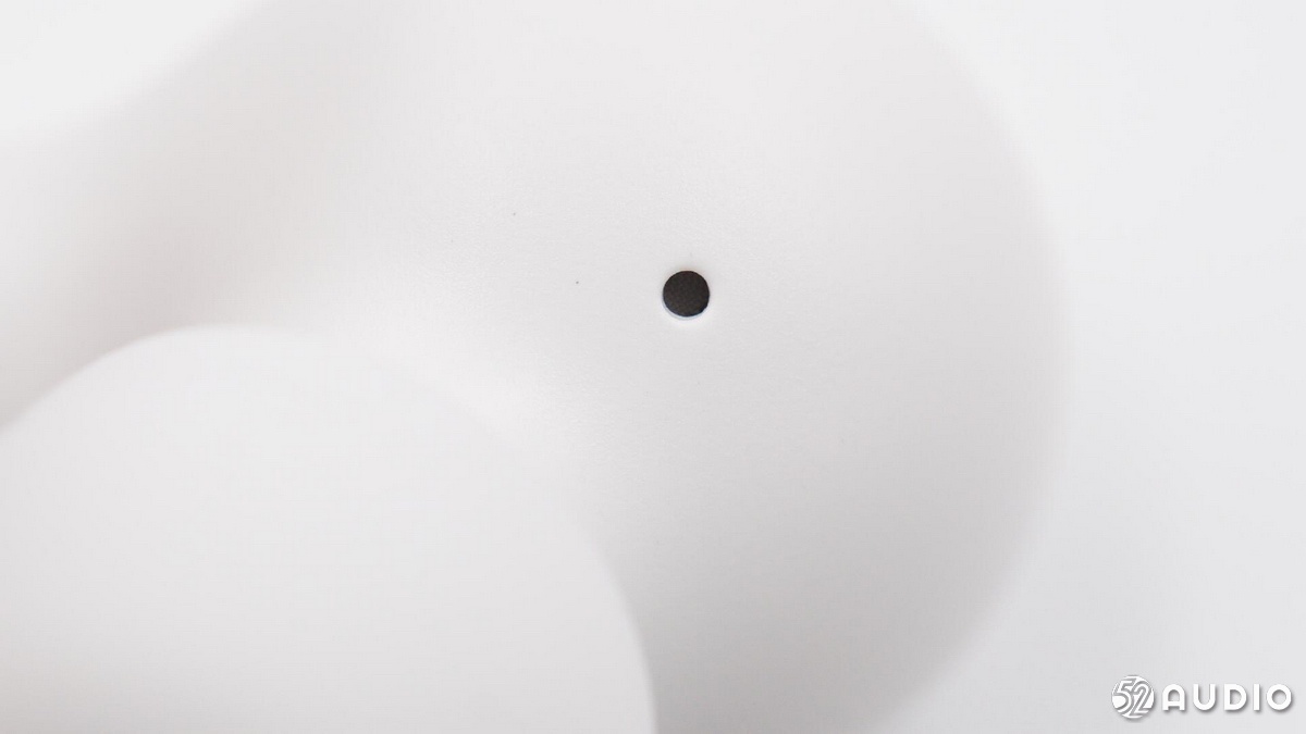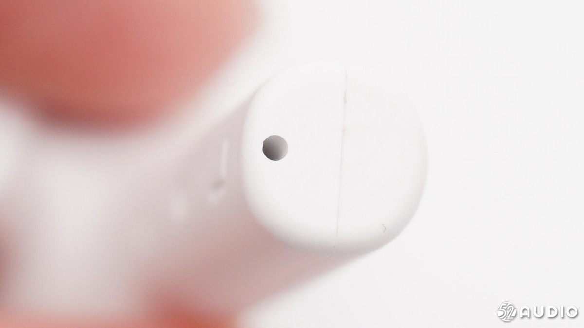 耳機(jī)柄底部特寫,依次是麥克風(fēng)、指示燈保護(hù)罩和藍(lán)牙天線。