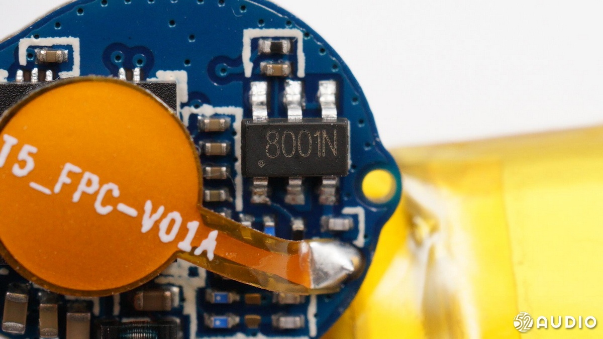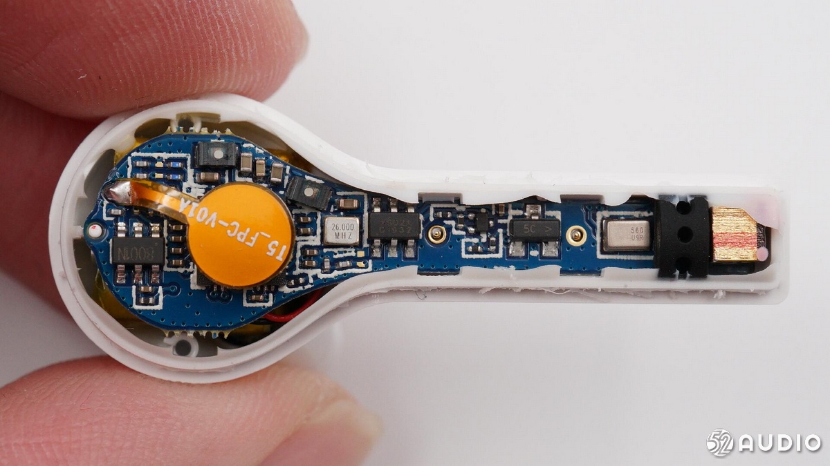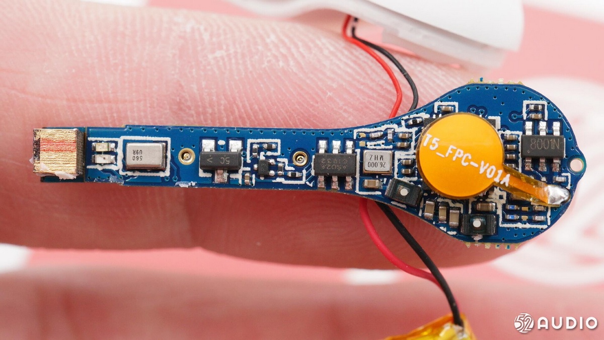 耳機(jī)部分,QCY T5 與T4一樣采用了原相 PAU1606FB-S1藍(lán)牙音頻SoC,支持藍(lán)牙5.0,其GeendRadio?立體聲技術(shù),具有左右耳快速切換、低延遲的特點(diǎn),被很多“游戲TWS”耳機(jī)采用。并且該芯片內(nèi)置鋰離子電池充電器,確保耳機(jī)電池的充電安全;耳機(jī)內(nèi)的軟包電池容量為43mAh,與T4一樣。耳機(jī)采用疊層貼片藍(lán)牙天線收發(fā)藍(lán)牙信號。