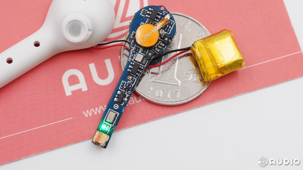 耳機(jī)主板和軟包電池與一元硬幣的尺寸對比。