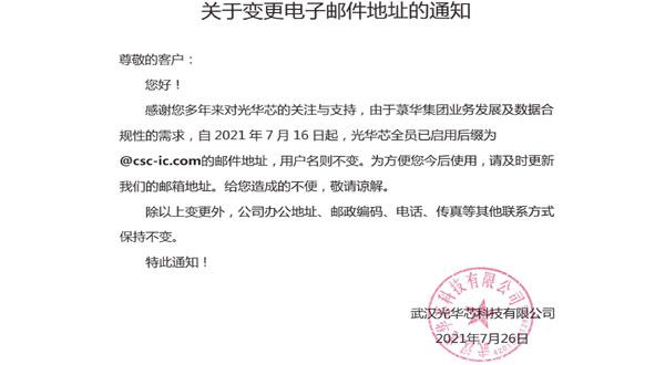 尊敬的客戶:您好!感謝您多年來對光華芯的關注與支持,由于菉華集團業(yè)務發(fā)展及數(shù)據(jù)合規(guī)性的需求,自2021 年7 月16 日起,光華芯全員己啟用后綴為@csc-ic.com的郵件地址,用戶名則不變。為方便您今后使用,請及時更...
