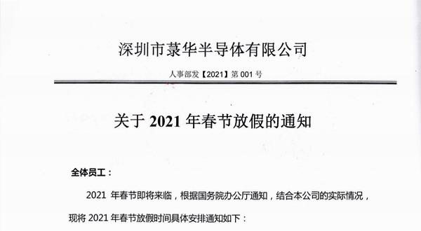 2021年春節(jié)即將來(lái)臨,根據(jù)國(guó)務(wù)院辦公廳通知,結(jié)合本公司的實(shí)際情況,我司2021年春節(jié)放假時(shí)間具體安排通知如下:2月7日至2月17日放假調(diào)休,共11天;2月18日(初七)正常上班。